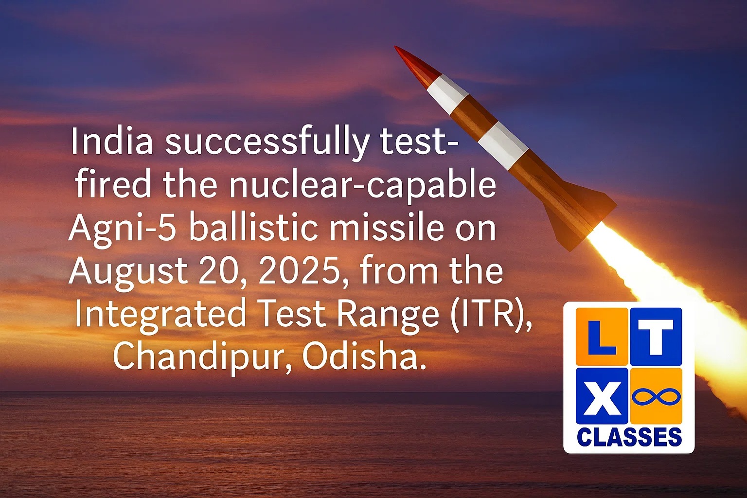 India successfully test-fired the nuclear-capable Agni-5 ballistic missile on August 20, 2025, from the Integrated Test Range (ITR), Chandipur, Odisha. The test was conducted by the Strategic Forces Command (SFC) under operational conditions to validate India's long-range deterrent capability. The missile has a strike range of up to 5,000 km, and this test strengthens India’s position as a credible nuclear power. 🛰️