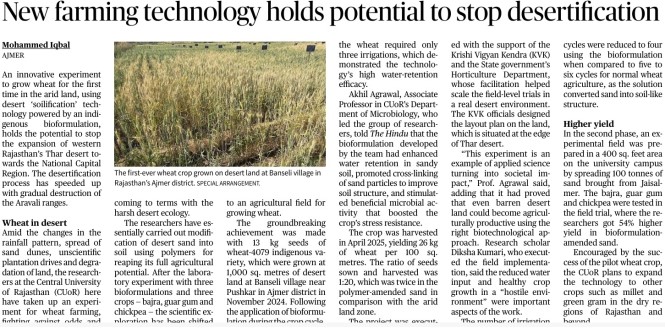 Krishi Vigyan Kendra (KVK) and the State Government's Horticulture Department, scaling from field-level trials in a real desert environment. · In the first phase (April 2025 harvest): 13 kg seeds of wheat-4079 indigenous variety were sown on 100 sq. meters of polymer-amended sand, yielding 26 kg— a sown-to-harvested ratio of 1:20, twice the normal 1:10 in arid zones. · In the second phase: An experimental field was prepared in a 400 sq. feet area by spreading 100 tonnes of sand brought from Jaisalmer. The bioformulation reduced irrigation cycles to four (from five to six normally) and enhanced soil structure into soil-like consistency. · Higher yield: The field yielded 54% higher bioformulation-amended sand, with encouraging results for expanding the technology to other green gram crops in dry regions of Rajasthan and beyond. · It noted the reduced water input and healthy crop growth as "hostile environment" important aspects, emphasizing its potential for millet and other drought-resistant crops.