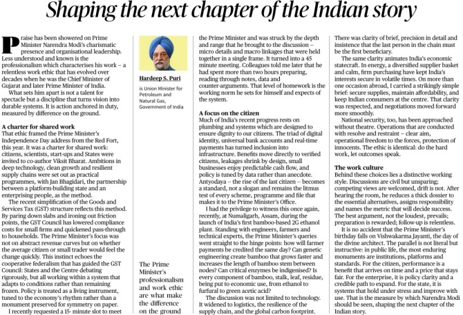 - The article, by Union Minister Hardeep S. Puri, reflects on Prime Minister Narendra Modi’s leadership style, work ethic, and governance philosophy.