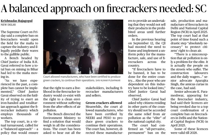 - Industry Grievances: Firecracker manufacturers' licenses (some valid till 2028) are being revoked due to the April 2025 Delhi-NCR ban; they seek relief to continue operations.