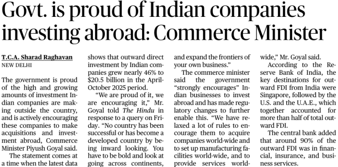 The Commerce Minister highlighted the sharp rise in outward foreign direct investment (OFDI) by Indian companies, following the release of recent data showing strong growth in overseas investments during 2025.