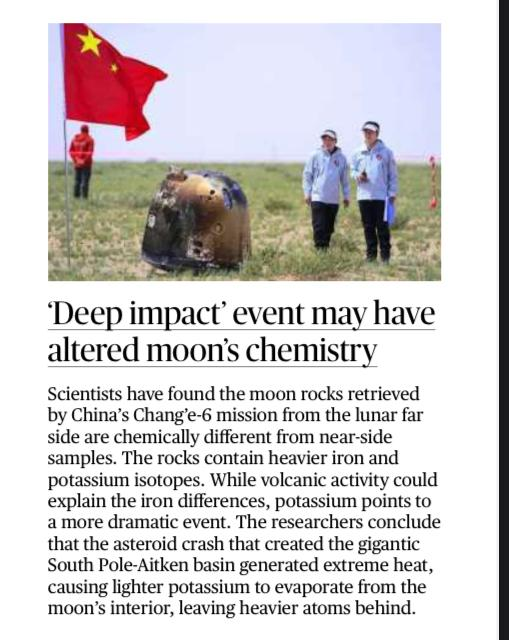 Scientists analysing lunar samples brought back by China’s Chang’e-6 mission found chemical differences between the Moon’s far side and near side, suggesting a massive asteroid impact altered the Moon’s internal chemistry.