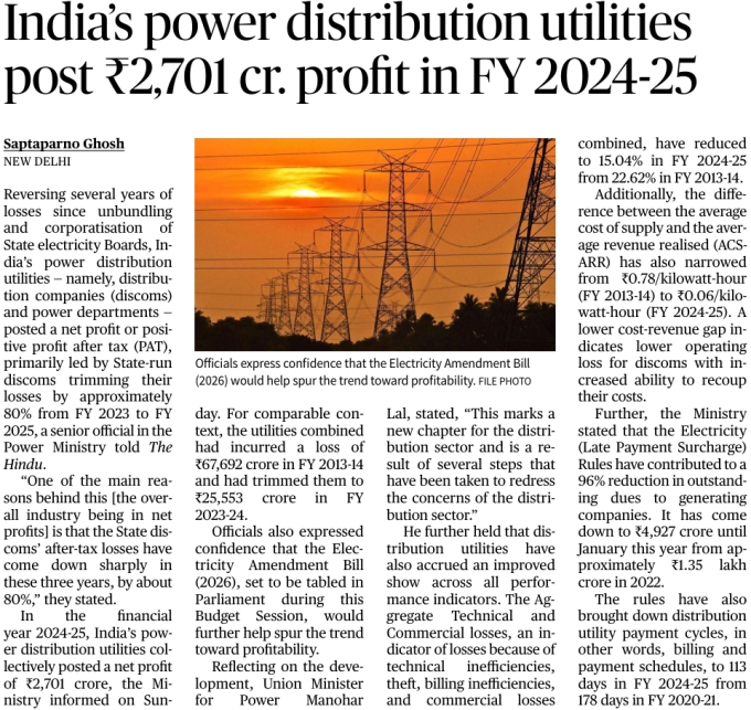 | 4. | India’s power distribution utilities post ₹2,701 cr. profit in FY 2024-25 | |