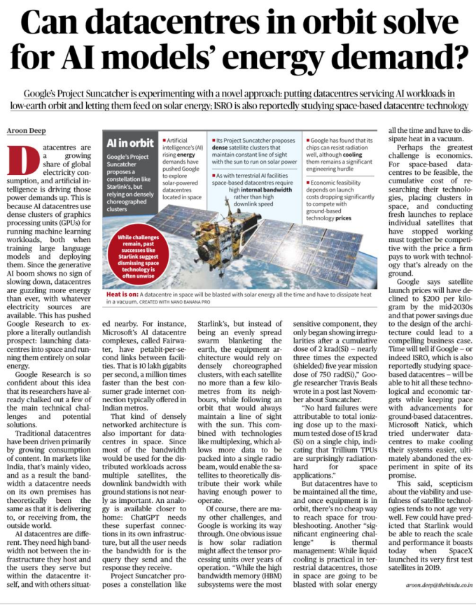 Aligns with India’s push in space economy and advanced digital infrastructure. Additional Information – Google. Project Suncatcher explores AI infrastructure beyond Earth to manage future energy constraints.Focuses on integrating space engineering with AI computing needs.