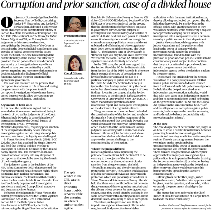 A two-judge Bench of the Supreme Court of India delivered a split verdict in Centre for Public Interest Litigation (CPIL) vs Union of India.The challenge was to Section 17A of the PC Act, introduced through amendments, requiring prior sanction for investigation into corruption allegations against public servants.The concern was that such a requirement could stall or prevent corruption inquiries, especially where the government itself may have a vested interest. Arguments Against Prior SanctionThe petitioners argued that corruption is antithetical to the rule of law, and executive control over sanction allows corruption to remain unchecked.Reliance was placed on earlier judgments like Vineet Narain vs Union of India (1998), which held that the executive cannot block or control corruption investigations.The N.N. Vohra Committee (1993) findings on the politician–bureaucrat–criminal nexus were cited to stress the need for independent investigative agencies.Section 17A was argued to revive the “Single Directive”, earlier struck down for violating Article 14 (equality before law). Government’s DefenceThe Union defended Section 17A as a safeguard for honest officers, protecting them from frivolous or mala fide investigations.It argued that earlier judgments dealt with administrative instructions, whereas Section 17A is a statutory provision.The government claimed that the provision seeks to balance accountability with administrative efficiency. Where the Judges DifferedJustice B.V. Nagarathna held Section 17A to be unconstitutional, as it:Creates an impermissible barrier to inquiry.Protects a class of public servants and substantively shields corruption.Places investigative consent in the hands of the very authority whose decisions are under scrutiny, leading to conflict of interest.Justice K.V. Viswanathan, while agreeing that unchecked executive control is problematic, upheld Section 17A:He found no fault with prior sanction per se.He interpreted the provision to mean that approval should come from an independent authority, not necessarily the political executive.He emphasised that striking down the provision could lead to policy paralysis, discouraging honest decision-making. Role of Lokpal