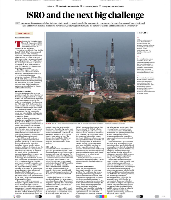 ISRO’s success has created a new benchmark where excellence is expected, not celebrated as an exception. The next big challenge lies in transforming India’s space programme from a hero-driven model to a resilient, industrial, and legally grounded ecosystem capable of executing ambitious missions routinely and reliably.
