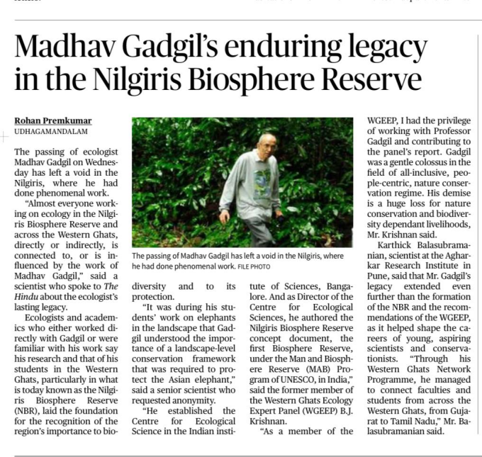 The passing of renowned ecologist Madhav Gadgil has drawn attention to his seminal contributions to ecology and conservation in the Nilgiris and the Western Ghats, particularly his role in shaping the Nilgiris Biosphere Reserve.Key Points