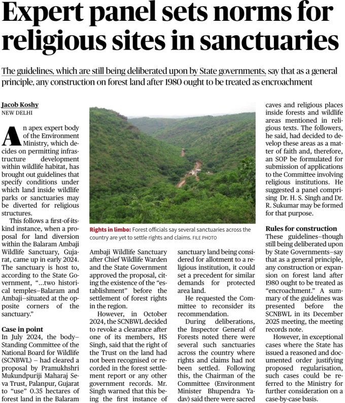 An apex expert body under the Ministry of Environment, Forest and Climate Change has issued guidelines on permitting religious structures inside wildlife sanctuaries, following concerns over land diversion and unresolved forest rights claims. Key PointsBackground of the Issue· The issue arose from a proposal related to Balaram Ambaji Wildlife Sanctuary, Gujarat, involving diversion of forest land for religious use.· It highlighted unresolved forest rights and the risk of setting precedents for similar demands in protected areas. Expert Panel and Its Role· The guidelines were framed by an expert body under the Ministry that advises on infrastructure development within wildlife habitats.· The aim is to regulate construction and expansion of religious sites inside protected areas. Core Guidelines· Any construction or expansion on forest land after 1980 should generally be treated as encroachment.· Religious structures inside sanctuaries cannot claim automatic legitimacy based on faith or historical presence.· Forest rights must be formally recognised and recorded before any consideration of land use.