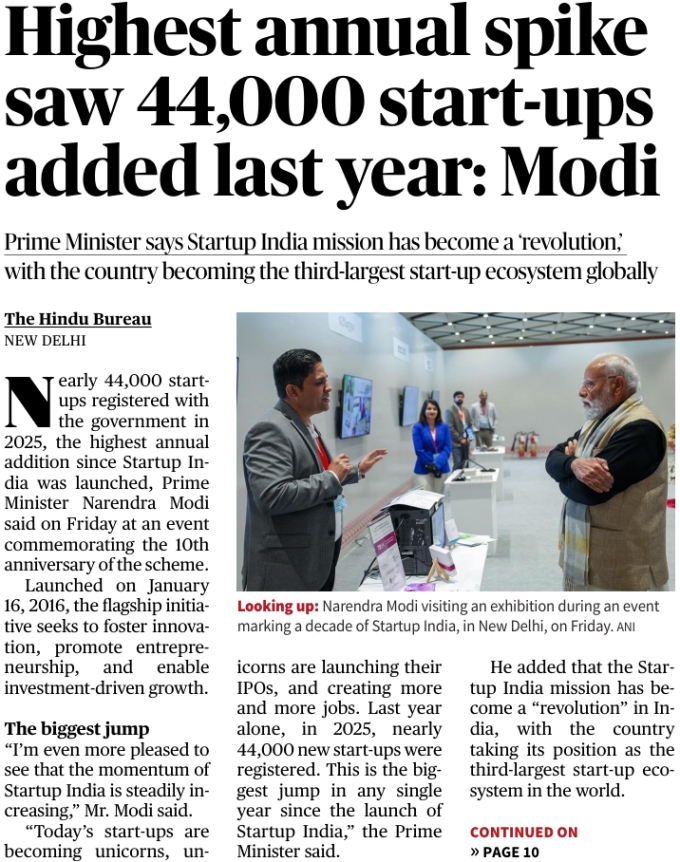 Prime Minister Narendra Modi highlighted that nearly 44,000 start-ups were registered in 2025, marking the highest annual addition since the launch of the Startup India mission, while addressing an event commemorating its 10th anniversary. Key PointsRecord Growth in Start-ups· Nearly 44,000 new start-ups were added in 2025.· This is the highest annual spike since the inception of Startup India.· Reflects growing entrepreneurial momentum across sectors. Startup India Mission· Launched on January 16, 2016.· Aims to:· Foster innovation· Promote entrepreneurship· Enable investment-driven growth Global Standing of India· India has emerged as the third-largest start-up ecosystem in the world.· Growth driven by:· Rising number of unicorns· Increased IPOs by start-ups· Expansion of job creation Economic Impact· Start-ups are:· Creating large-scale employment· Supporting technology-driven solutions· Strengthening India’s position in the global innovation landscape Startup India· Flagship initiative of the Government of India.· Provides:· Regulatory support· Tax incentives· Funding and incubation ecosystem· Focuses on building a robust start-up and innovation culture. UPSC Prelims Practice QuestionQ. Consider the following statements regarding the Startup India initiative:1.Startup India was launched in 2016 to promote innovation and entrepreneurship.2.India currently ranks as the largest start-up ecosystem in the world.Which of the statements given above is/are correct?(a) 1 only