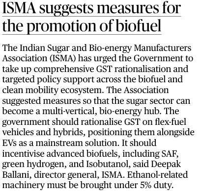 The Indian Sugar and Bio-energy Manufacturers Association urged the Union government to undertake GST rationalisation and targeted policy support to promote biofuels and strengthen the clean mobility ecosystem.