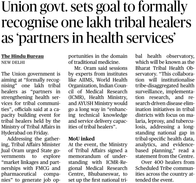 Ministry of Tribal Affairs signed an MoU with ICMR–Regional Medical Research Centre, Bhubaneswar.· Objective is to establish the first national tribal health observatory. Bharat Tribal Health Observatory· The observatory will:o Institutionalise tribe-disaggregated health surveillanceo Support implementation researcho Promote research-driven disease elimination· Special focus on diseases such as:o Malariao Leprosyo Tuberculosis· Addresses long-standing gaps in tribal-specific health data and evidence-based planning. Participation· Over 400 tribal healers from Scheduled Tribe communities across India attended the event.