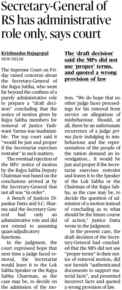 A Bench of Justices Dipankar Datta and S.C. Sharma held that the Secretary-General of the Rajya Sabha has a purely administrative role.· The Court stated that preparing a “draft decision” on the admissibility of a motion goes beyond administrative authority.