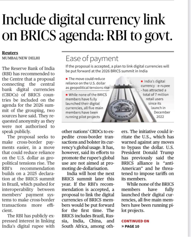 The Reserve Bank of India (RBI) has suggested that a proposal to link central bank digital currencies (CBDCs) of BRICS countries be included on the agenda of the 2026 BRICS Summit, which will be hosted by India, to ease cross-border payments.