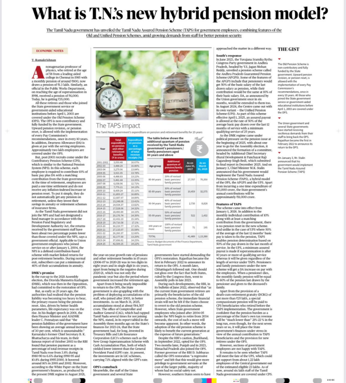 The article examines the Tamil Nadu Assured Pension Scheme (TAPS) introduced by the Tamil Nadu government, a hybrid pension model combining elements of the Old Pension Scheme (OPS) and the Unified/National Pension System (UPS/NPS), against the backdrop of long-standing employee demands for pension security and fiscal sustainability concerns.