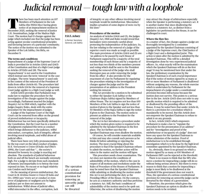 The author analyses India’s constitutional mechanism for the removal of judges in the backdrop of a recent impeachment notice against a High Court judge, and argues that despite being intentionally stringent, the law contains a serious procedural loophole that can defeat the purpose of judicial accountability.