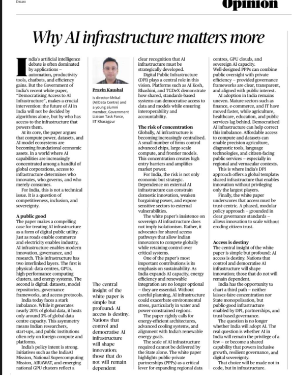 The author argues that India’s AI future will be shaped not merely by applications and algorithms, but by who controls access to AI infrastructure such as compute power, datasets, and model ecosystems, as highlighted in the government’s white paper on democratising access to AI infrastructure.