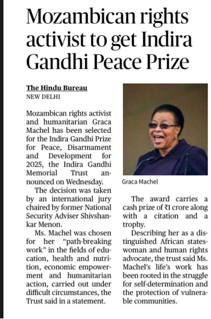 Mozambican human rights activist Graca Machel has been selected for the Indira Gandhi Prize for Peace, Disarmament and Development for 2025, as announced by the Indira Gandhi Memorial Trust. Key PointsSelection and JuryDecision taken by an international jury chaired by Shivshankar Menon.Selection recognises path-breaking humanitarian work. Reasons for the AwardHonoured for contributions in education, health, nutrition, economic empowerment, and humanitarian action.Her work is rooted in self-determination and protection of vulnerable communities. Award DetailsAward includes a cash prize of ₹1 crore, a citation, and a trophy.Conferred by the Indira Gandhi Memorial Trust. Indira Gandhi Peace PrizeInstituted in 1986 in memory of Indira Gandhi.Also known as the Indira Gandhi Prize for Peace, Disarmament, and Development.Awarded annually to individuals or organisations without distinction of nationality, race, or religion.Recognises efforts towards international peace, disarmament, economic cooperation, development, scientific progress for human good, and expansion of freedom.Past recipients include: Mikhail Gorbachev, UNICEF, Jimmy Carter, UN & Kofi Annan, Angela Merkel, ISRO, Manmohan Singh, Sir David Attenborough, Pratham NGO, Indian Medical Association, Daniel Barenboim & Ali Abu Awwad. UPSC Prelims Practice QuestionQ. Consider the following statements regarding the Indira Gandhi Peace Prize:1.It is awarded annually to individuals or organisations irrespective of nationality.2.It was instituted in 1986 by the Government of India.Which of the statements given above is/are correct?(a) 1 only
