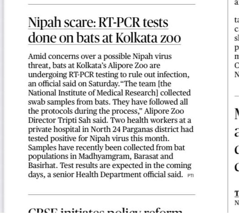 | 5. | Nipah scare: RT-PCR tests done on bats at Kolkata zoo | |