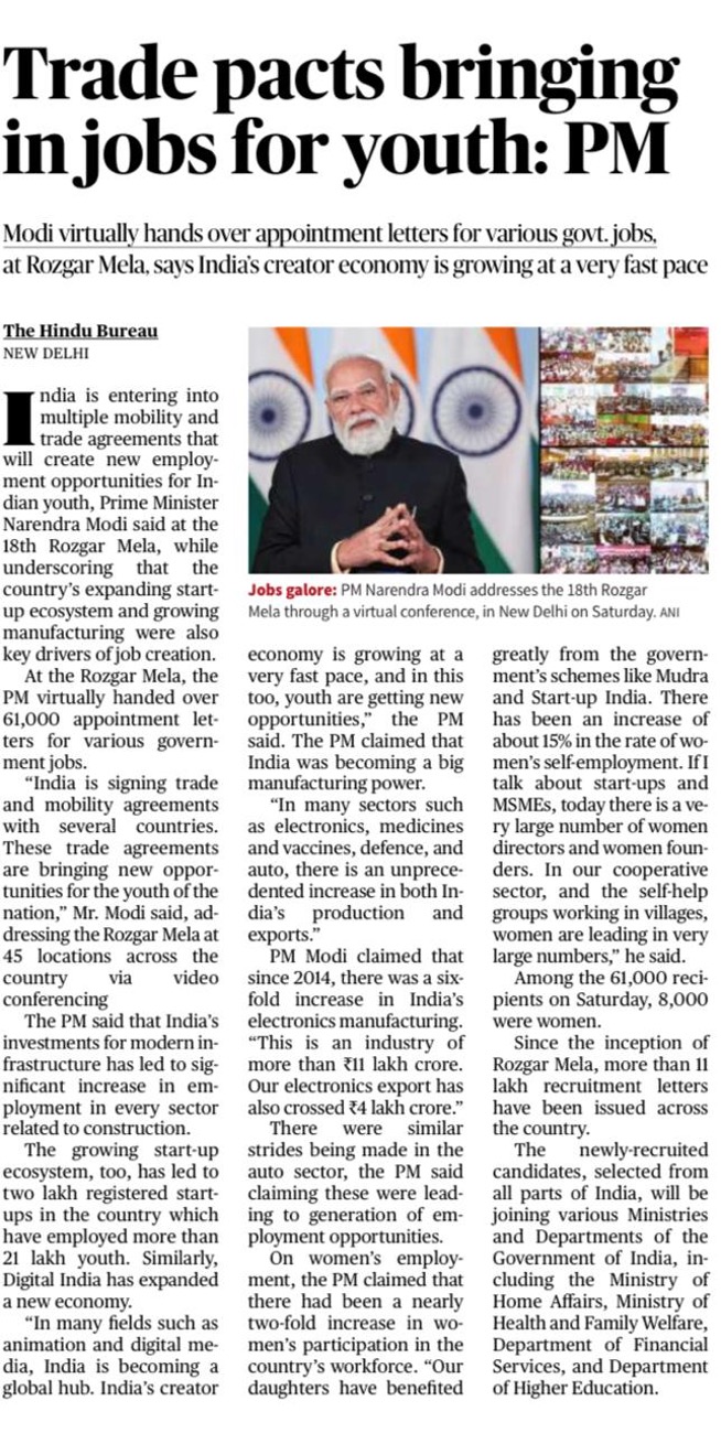 At the 18th Rozgar Mela, the Prime Minister highlighted that trade and mobility agreements, along with manufacturing and start-up growth, are generating large-scale employment opportunities for Indian youth.