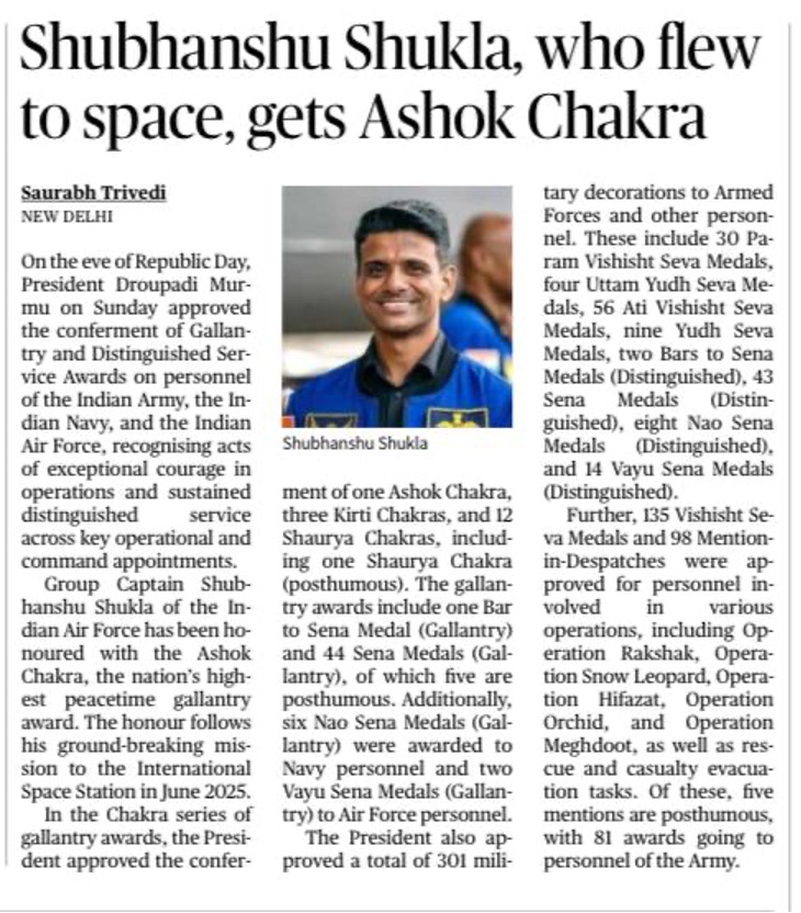 On the eve of Republic Day, the President of India approved Gallantry Awards, including the Ashok Chakra to Group Captain Shubhanshu Shukla of the Indian Air Force, recognising his exceptional courage and distinguished service, including his role as the first Indian to travel to the International Space Station (ISS) in June 2025.