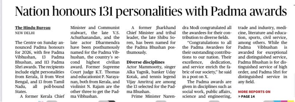 | 7. | Nation honours 131 personalities with Padma awards | |
