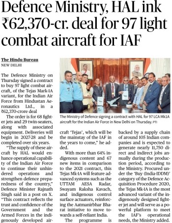 | 5. | Defence Ministry, HAL ink ₹62,370-cr. deal for 97 light combat aircraft for IAF |