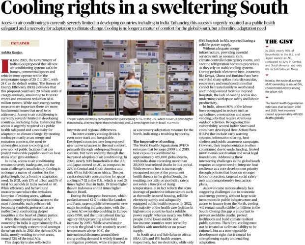 Amid escalating global temperatures driven by climate change, access to cooling technologies like air conditioning (AC) has transitioned from a luxury to a public health imperative, particularly in the Global South where heatwaves are intensifying. · Triggered by India's June 2025 government proposal for mandatory energy-efficient AC systems in new homes, commercial spaces, and vehicles, the piece underscores the urgency of cooling as an adaptation strategy. · Globally, the World Health Organization (WHO) estimates that between 2000 and 2019, approximately 489,000 heat-related deaths occurred annually, with projections of a 370% surge by 2050 if unchecked. · In India, where summer temperatures routinely exceed 40°C and the national average AC ownership is around 5% (concentrated among the urban rich), this disparity exacerbates health risks, productivity losses, and socio-economic inequalities. · The context is amplified by regional comparisons: while the U.S. boasts 90% AC ownership, Sub-Saharan Africa lingers at 6%, and India at 5%—revealing a "cooling divide" that mirrors broader North-South inequities in climate resilience.