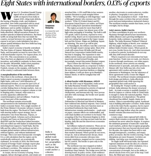In August 2025, the U.S. under Donald Trump imposed an additional 25% tariff on Indian imports, citing trade deficits, India’s purchase of Russian crude oil despite sanctions, and past precedents like steel tariffs. · The move, announced amid U.S.-China tensions, exposed vulnerabilities in India’s export-dependent economy, heavily reliant on the U.S. for textiles, pharmaceuticals, and electronics. · India’s response was measured diplomacy without public retaliation, but it revealed structural flaws in the country’s trade setup. · Exports are spatially concentrated in coastal hubs, so disruptions there create nationwide ripple effects. · In contrast, the northeastern states, despite sharing 5,400 km of international borders with five countries (longer than the western frontier), contribute only 0.13% of exports, lacking operational trade corridors. · This neglect keeps the northeast as an economic enclave under a “silent border” approach, worsening tariff shocks and weakening India’s Act East Policy, hence the call for inclusive border trade. Detailed Analysis