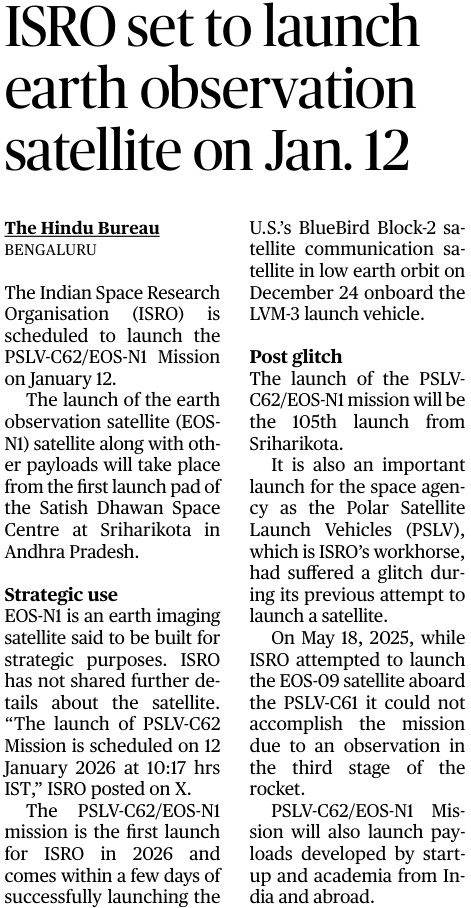 4. | ISRO set to launch earth observation satellite on Jan. 12 | |