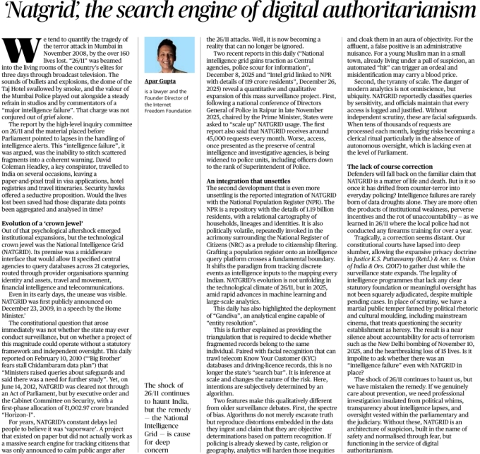 The author examines the evolution of the National Intelligence Grid (NATGRID) from a counter-terror tool into a large-scale surveillance architecture, warning that its expansion, integration with population databases, and lack of oversight risk undermining constitutional freedoms and accountability.