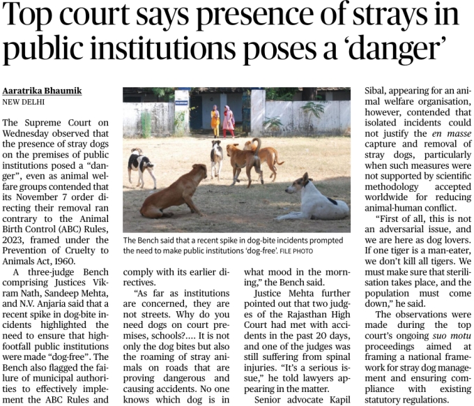 ContextThe Supreme Court observed that the presence of stray dogs in public institutions such as schools and courts poses a danger, especially in light of a recent spike in dog-bite incidents, and flagged lapses in implementation of existing rules by municipal authorities.