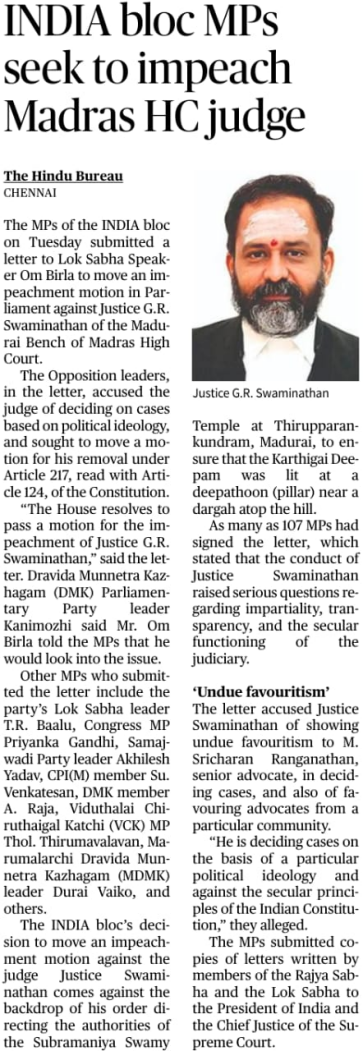 | 4. | INDIA bloc MPs seek to impeach Madras HC judge | |