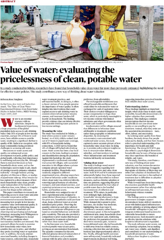 Clean water is indispensable for survival, health, and overall human well-being, yet substantial sections of India’s population lack access to safe drinking water. Despite technological and policy improvements, nearly 30% of rural households still rely on unsafe sources. The editorial is based on a rigorous experimental study conducted in Odisha which provides rare, empirical evidence of how households truly value clean water, challenging long-standing assumptions that low-income households are unwilling to pay for improved water quality.