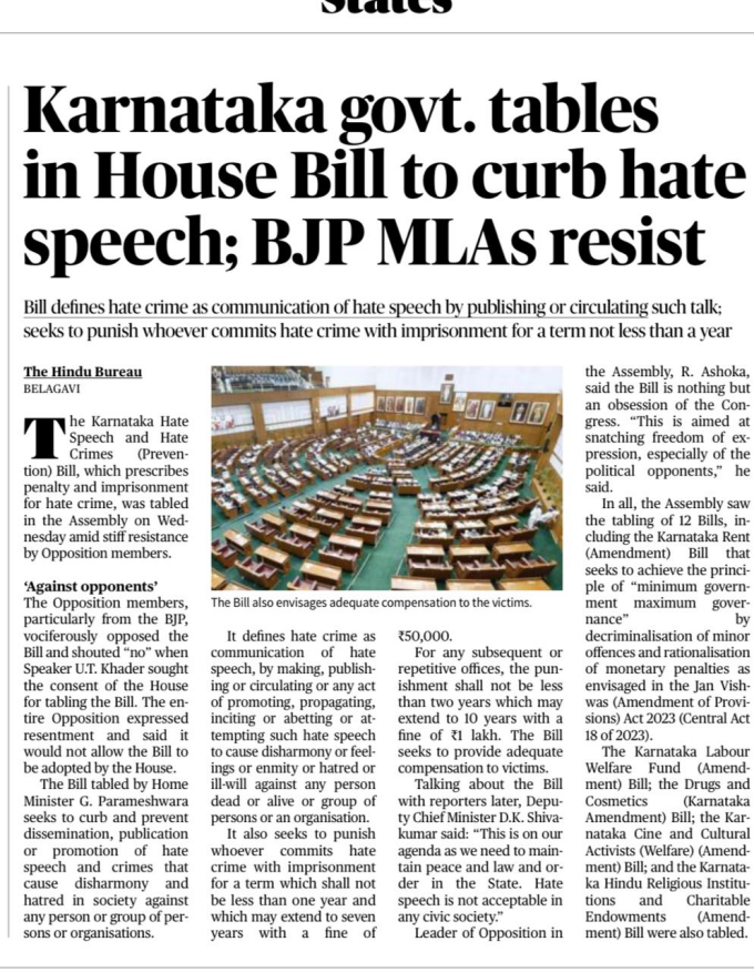 The Karnataka government introduced the Karnataka Hate Speech and Hate Crimes (Prevention) Bill in the Assembly to curb dissemination and promotion of hate speech. Opposition MLAs resisted its introduction, alleging curbs on free expression.