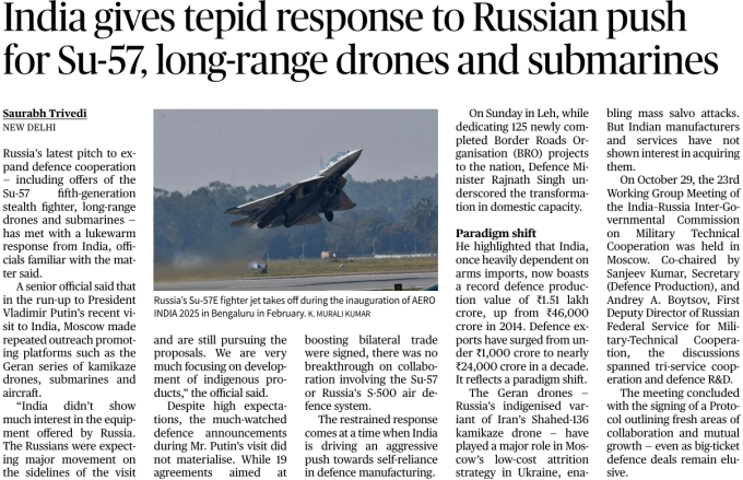 | 6. | India gives tepid response to Russian push for Su-57, long-range drones and submarines |