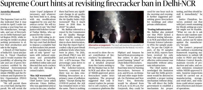 Current Developments A Bench headed by Chief Justice of India B.R. Gavai and Justice K. Vinod Chandran stated that it would consider allowing the limited sale and use of NEERI-certified green firecrackers under strict monitoring.