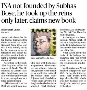 Context A new book titled “The Forgotten Indian Prisoners of World War II” by Gautam Hazarika challenges the widely held belief that Netaji Subhas Chandra Bose founded the Indian National Army (INA). The book claims that the INA was initially established by Japanese Army intelligence in collaboration with Indian nationalists living abroad to fight against the British, and that Netaji took charge only later, transforming it into a powerful symbol of India’s struggle for freedom.