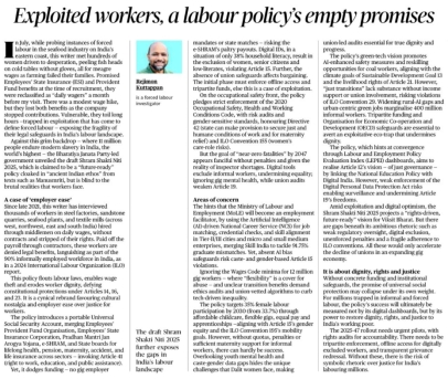 Context The article critiques India’s labour policy framework, particularly the draft Shram Shakti Niti 2025, which claims to create a “future-ready” workforce but fails to address the ground realities of worker exploitation, job insecurity, and erosion of legal protections.