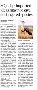 Syllabus: GSIII – Environment & Biodiversity Conservation Context Supreme Court Judge Justice P.S. Narasimha observed that many environmental law principles imported from the West, such as “inter-generational equity”, may not be effective in conserving India’s endangered species like the Great Indian Bustard and Lesser Florican.