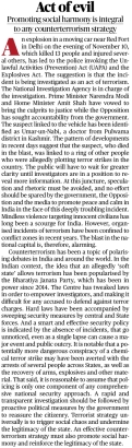 Such incidents underscore the persistent terror threats in urban areas, highlighting the need for robust intelligence and preemptive security measures rather than reactive policing.2. Political and Public Response The government has vowed strict action, while the Opposition has sought transparency and accountability. The editorial stresses that speculation, political blame games, and media sensationalism must be avoided until investigations are complete. It emphasizes that peace and calm must be collectively preserved during such crises to avoid communal polarization.