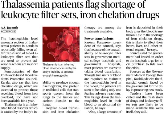 | 7. | Thalassemia patients flag shortage of leukocyte filter sets, iron chelation drugs |
