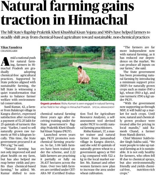 Context Farmers in Himachal Pradesh are steadily transitioning from chemical-based agriculture to natural and sustainable farming practices under the State’s flagship scheme — Prakritik Kheti Khushhal Kisan Yojana (PK3Y).