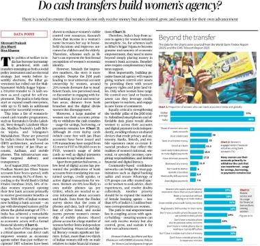 Do they genuinely enhance women’s control, decision-making power, and long-term empowerment? What is it All About The article explores whether schemes like Bihar’s Mukhyamantri Mahila Rojgar Yojana, Karnataka’s Gruha Lakshmi, West Bengal’s Lakshmir Bhandar, and Madhya Pradesh’s Ladli Behna Yojana — which provide direct cash support to women — have gone beyond mere financial inclusion to build economic agency. It analyses the gap between account ownership and account usage, and the structural barriers preventing women from fully leveraging financial instruments.