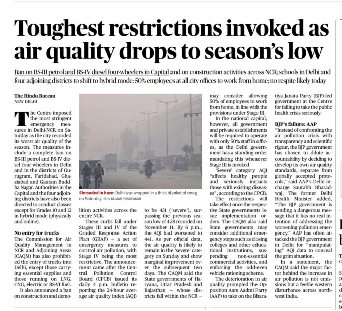 • CPCB stated that severe AQI impacts even healthy individuals and severely affects those with existing illnesses.