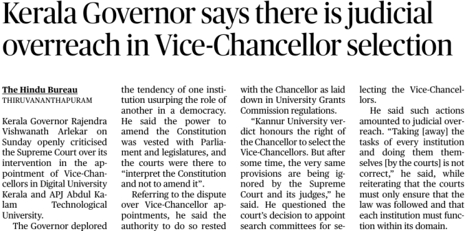 The Kerala Governor criticised the Supreme Court’s interventions in the appointment of Vice-Chancellors in State universities, alleging judicial overreach and encroachment into domains assigned to constitutional and statutory authorities.