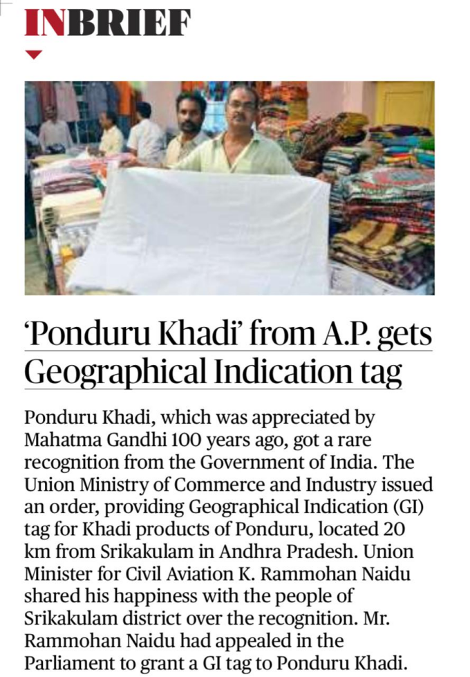 1. Ponduru khadi is a handspun cotton fabric from Srikakulam district of Andhra Pradesh and has recently received a GI tag.