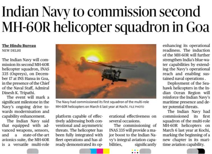 | 8. | Indian Navy to commission second MH-60R helicopter squadron in Goa | |
