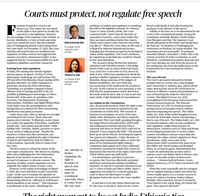 The article discusses recent Supreme Court observations on online content regulation and cautions against judicial overreach that may convert courts from protectors of free speech into regulators, thereby undermining constitutional freedoms.