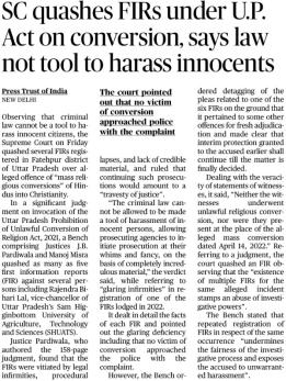 | 5. | SC quashes FIRs under U.P. Act on conversion, says law not tool to harass innocents |