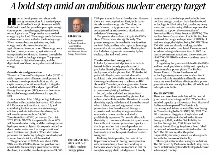 The article analyses India’s growing energy needs in relation to human development and argues that achieving higher HDI levels and deep decarbonisation requires a major expansion of nuclear power, supported by recent legislative and policy changes such as the